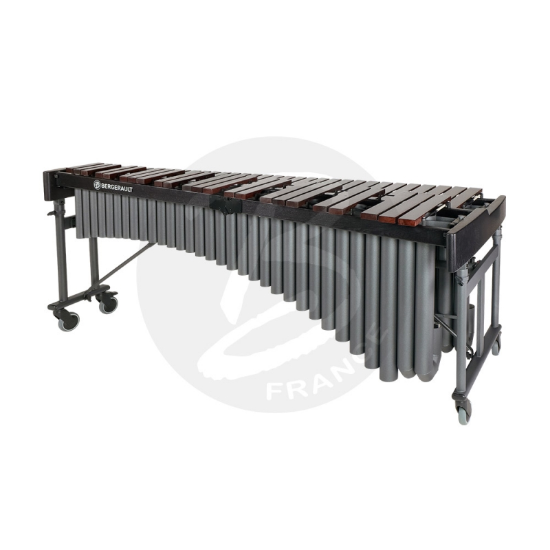Bergerault 4.5 oct. Campus Bass marimba – Honduras rosewood bars Range: 4.5 oct. F2-C7 Tuning A=442 Hz Entirely dismatable & foldable Black wooden / anthracite steel frame Aluminum resonators / silver anthracite coating 4 castors Ø 100 mm, 2 with brakes Adjustable height with hydropneumatic assistance Honduras rosewood bars width: 70 to 40 mm (+/- 1 mm) Bars thickness: 24 mm Length: 2120 mm Width: 890 to 320 mm Adjustable height: 860 to 970 mm With cover and mallets