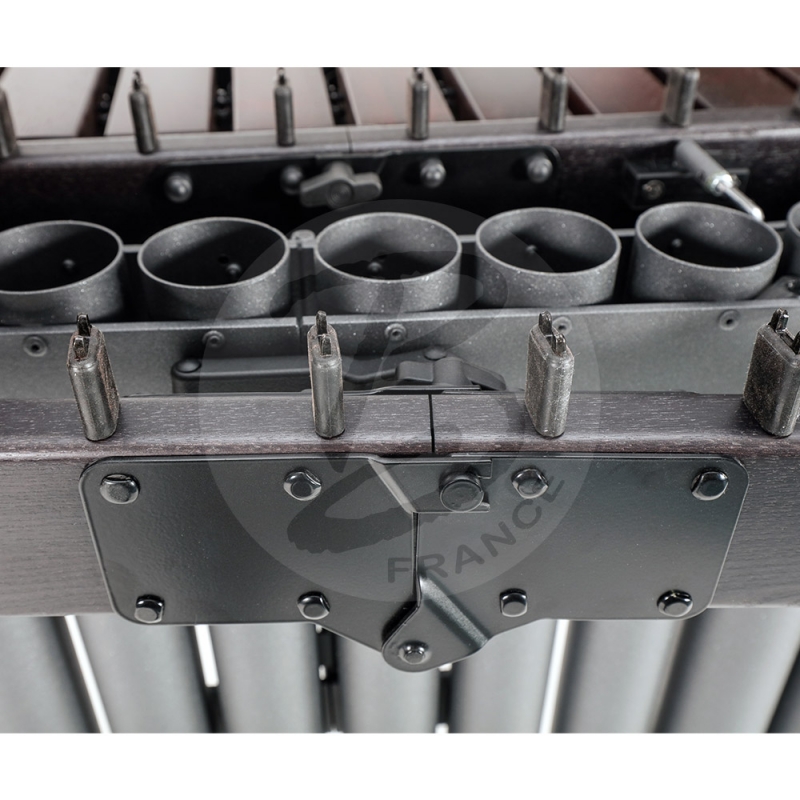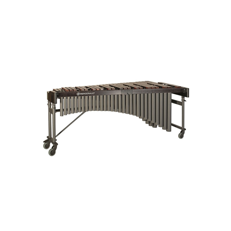 Bergerault 4.3 oct. Campus marimba – Honduras rosewood bars Range: 4.3 oct. A2-C7 Tuning A=442 Hz Black veined removable & foldable frame Wooden frame, dismantable Aluminum resonators / silver anthracite coating 4 castors Ø 100 mm, 2 with brakes Adjustable height with hydropneumatic jacks Honduras rosewood bars width: 70 to 40 mm Bars thickness: 24 mm Length: 1980 mm Width: 860 to 320 mm Adjustable height: 860 to 970 mm With cover and mallets
