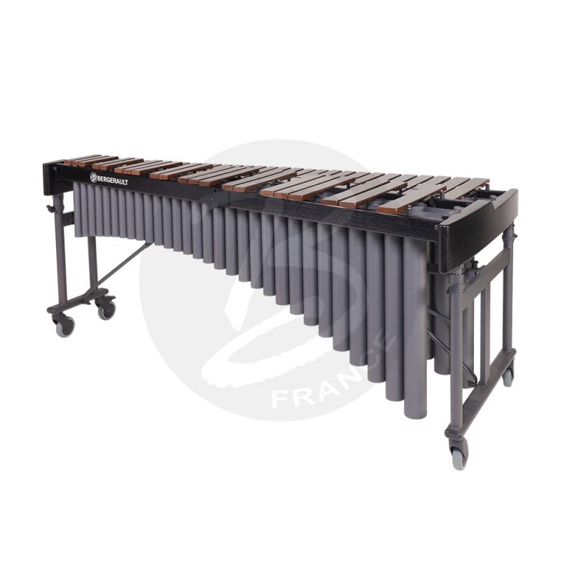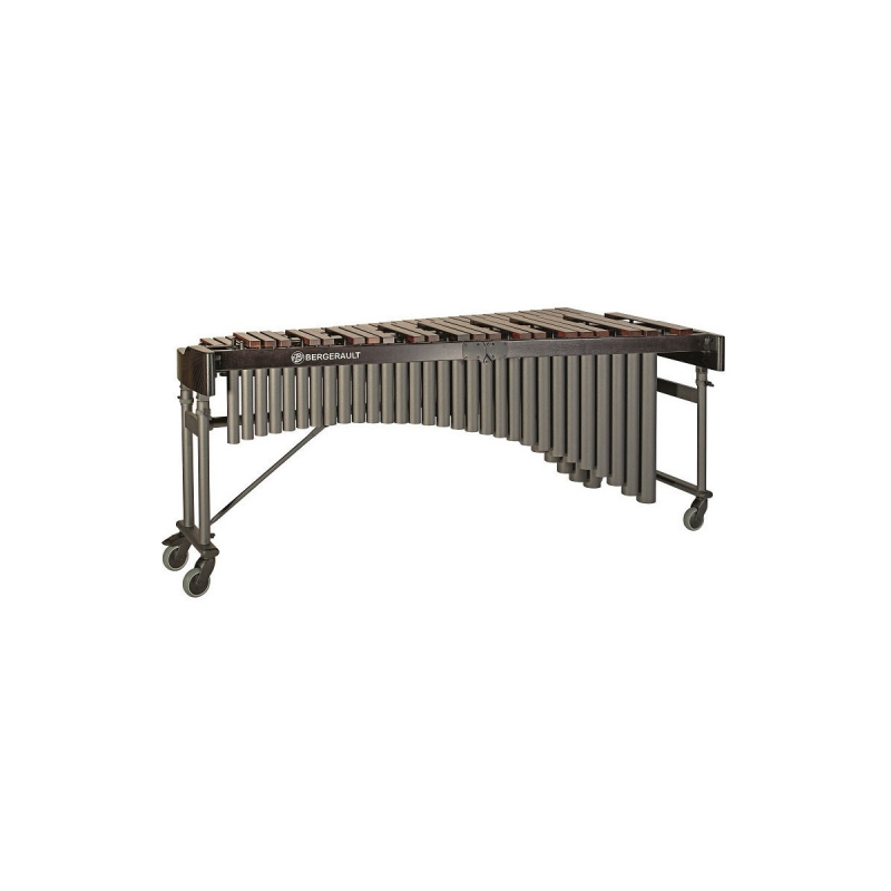 Bergerault 4.3 oct. Campus marimba – African rosewood bars Range: 4.3 oct. A2-C7 Tuning A=442 Hz Black veined removable & foldable frame Wooden frame, dismantable Aluminum resonators / silver anthracite coating 4 castors Ø 100 mm, 2 with brakes Adjustable height with hydropneumatic jacks African rosewood bars width: 70 to 40 mm Bars thickness: 24 mm Length: 1980 mm Width: 860 to 320 mm Adjustable height: 860 to 970 mm With cover and mallets