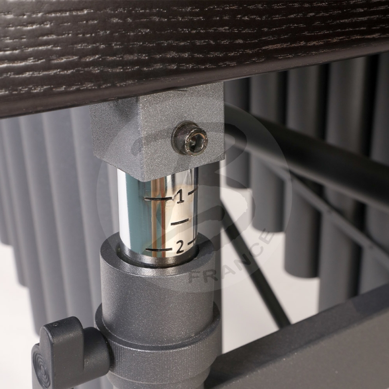 Bergerault 4.3 oct. Campus marimba – Padouk bars Range: 4.3 oct. A2-C7 Tuning A=442 Hz Black veined removable & foldable frame Wooden frame, dismantable Aluminum resonators / silver anthracite coating 4 castors Ø 100 mm, 2 with brakes Adjustable height with hydropneumatic jacks Padouk bars width: 70 to 40 mm Bars thickness: 24 mm Length: 1980 mm Width: 860 to 320 mm Adjustable height: 860 to 970 mm With cover and mallets