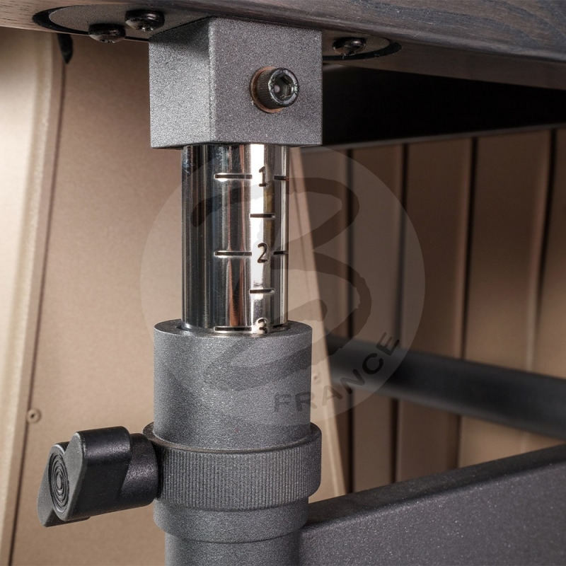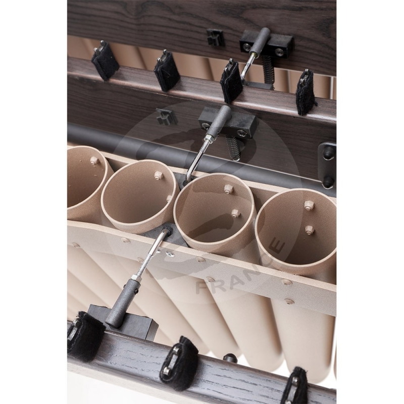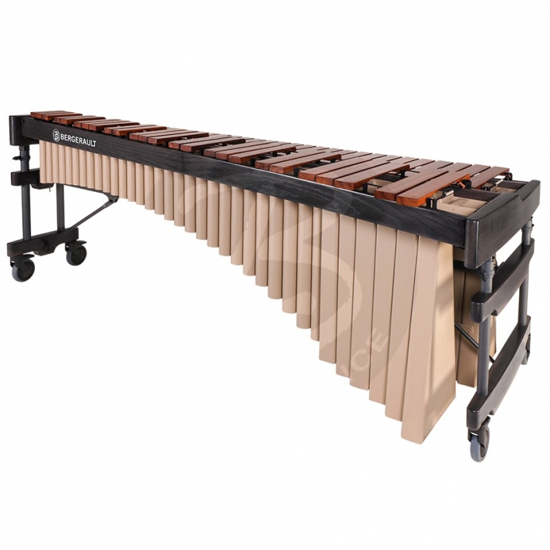 Bergerault 5 oct. Signature Solo marimba – Premium Honduras Rosewood bars Range: 5 oct. C2-C7 Tuning A=442 Hz Finish: grain wood grey frame Aluminum resonators "Champagne" coating 4 castors Ø 100 mm, 2 with brakes Adjustable height with hydropneumatic jacks Premium Honduras Rosewood bars