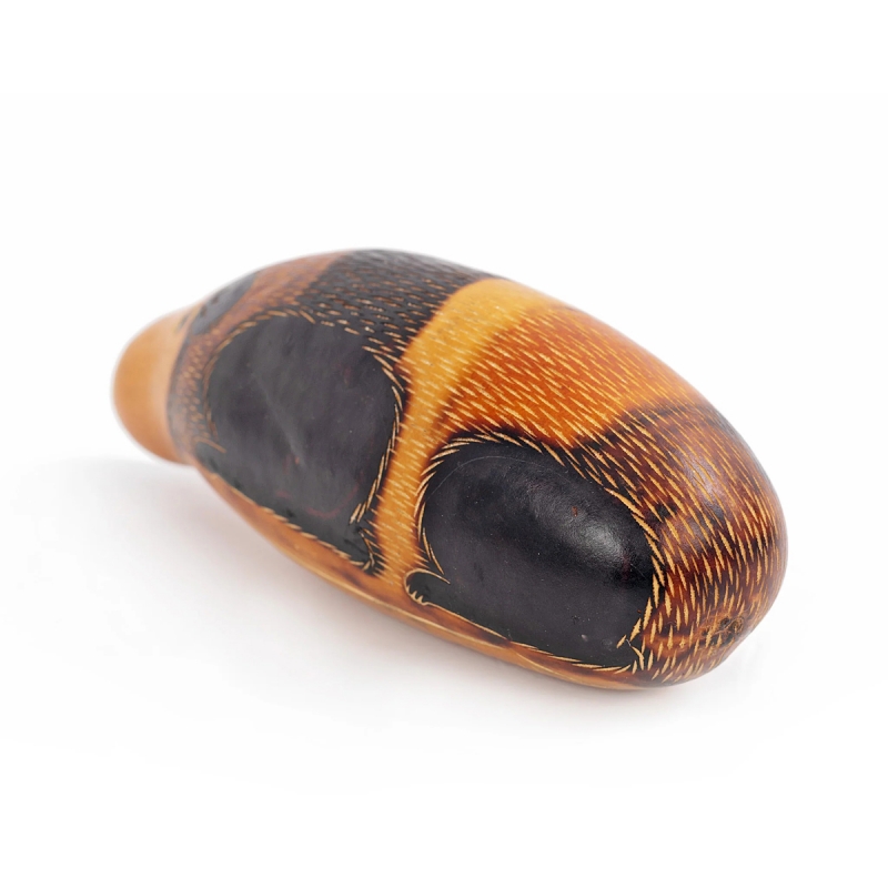 The gourd is a large fleshy fruit, grown naturally in Peru and has many domestic and musical uses for thousands of years. This guiro and shaker is made by drying and hollowing out the gourd, adding beads and ridges then finishing with the hand painted guinea pig design.