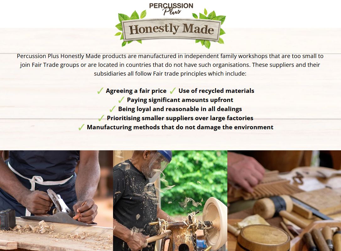 This guiro and shaker is sourced using Fair trade principles. See below for more information about the Honestly Made range of musical instruments from Percussion Plus.