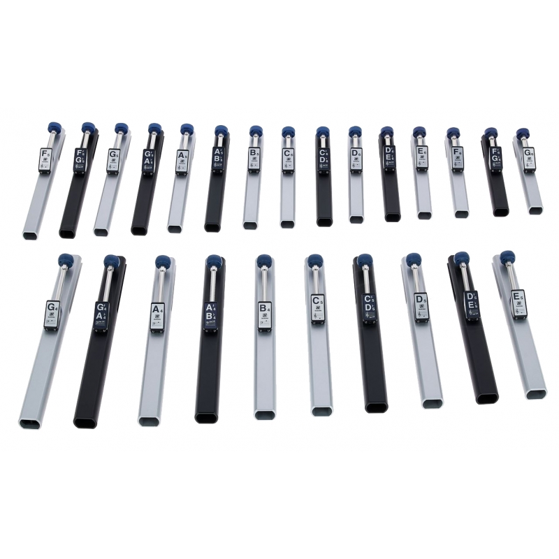 This 25 note set has a range of G4 - G6 and comes complete in a solid, hard wearing carry case. This particular set is seen as core product, but the range is fully expandable with various other complimentary sets available to order. Rather uniquely this core set of 25 chime bars or bells can be expanded up to a fully chromatic 5 octave range by the addition of the following products: