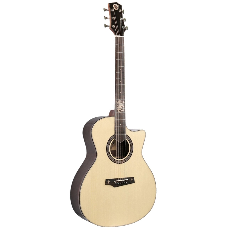 A Randon AL GC+ akusztikus gitár a kiváló minőségű összetevőket ötvözi a modern dizájnnal, így a zene szerelmeseinek egy sokoldalú, kifejező hangszert kínál Grand Auditorium kivágott konstrukcióban. Erőteljes, tiszta hangzása és átgondolt anyagválasztása ideális választássá teszi ezt az akusztikus gitárt azoknak a játékosoknak, akik kiegyensúlyozott hangzást, kényelmes játszhatóságot és vonzó megjelenést keresnek – legyen szó akár nappaliról, stúdióról vagy színpadról. Tömör lucfenyő tetővel, rózsafa oldalakkal és hátlappal, valamint mahagóni nyakkal a Randon AL GC+ Pro a klasszikus akusztikus gitár-felszerelést testesíti meg, amely a sokoldalúság és a dinamikus hangzás szinonimája. Ezen hangfák kombinációja tiszta, artikulált hangzást biztosít erőteljes basszussal, ragyogó magas hangokkal és gazdag középfrekvenciákkal – ideális ujjpengetéshez, pengetéshez vagy szólózáshoz.