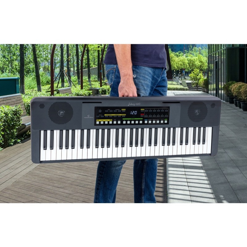 A Soundsation JUKEY-610 billentyűzet tökéletes azoknak, akik szeretnének elkezdeni zongorán játszani. A 61 zongoratípusú billentyűvel, 300 különböző hanggal, 300 kísérő ritmussal és 80 demódallal felszerelt billentyűzet lehetővé teszi a felhasználó számára, hogy szórakozás közben különböző zenei műfajokat játszhasson. Néhány funkció, amellyel a JUKEY-610 fel van szerelve, mint például a DUAL, SPLIT és felvétel, általában a nagyobb billentyűzeteken található, így a felhasználók kibontakoztathatják kreativitásukat. Hozzáadhat egy sustain pedált (nem tartozék) a hitelesebb zongoraelőadások érdekében. A hanglejátszás két integrált 5 wattos hangszórón keresztül történik. A kompaktság, az elemes működés lehetősége és a házba integrált fogantyúnak köszönhető könnyű szállíthatóság teszi ezt a billentyűzetet a tanulmányi használatra is orientált hangszerré. Az összes funkció eredménye egy jó billentyűzet, amely kiváló értéket képvisel a piaci szegmensében.